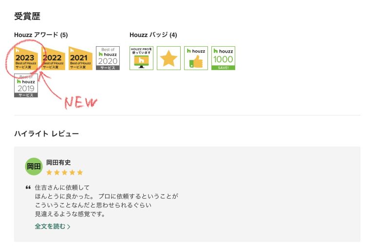 HPをリニューアルしてからは、Houzzに許可をもらってこのサイト内にもレビューを掲載しています。各プロジェクトに紐づけられていて、紐づけのないものもレビューアーカイブから見てもらえます。写真と合わせて見られる!まだ少ししか掲載できてないので、今後拡充させていきます。